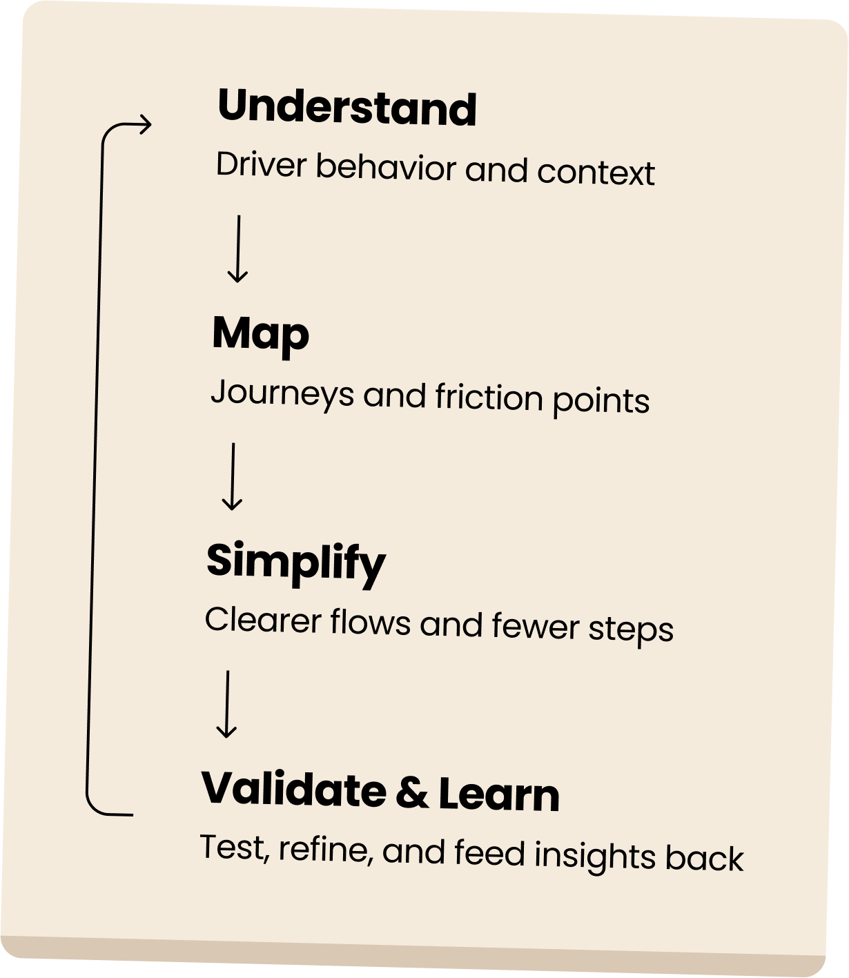 My role focused on improving usability across key flows while also bringing more structure to the design process itself. This meant designing clearer end-to-end experiences, reducing friction in critical tasks, and helping build a component-based system that made the product more consistent and scalable.