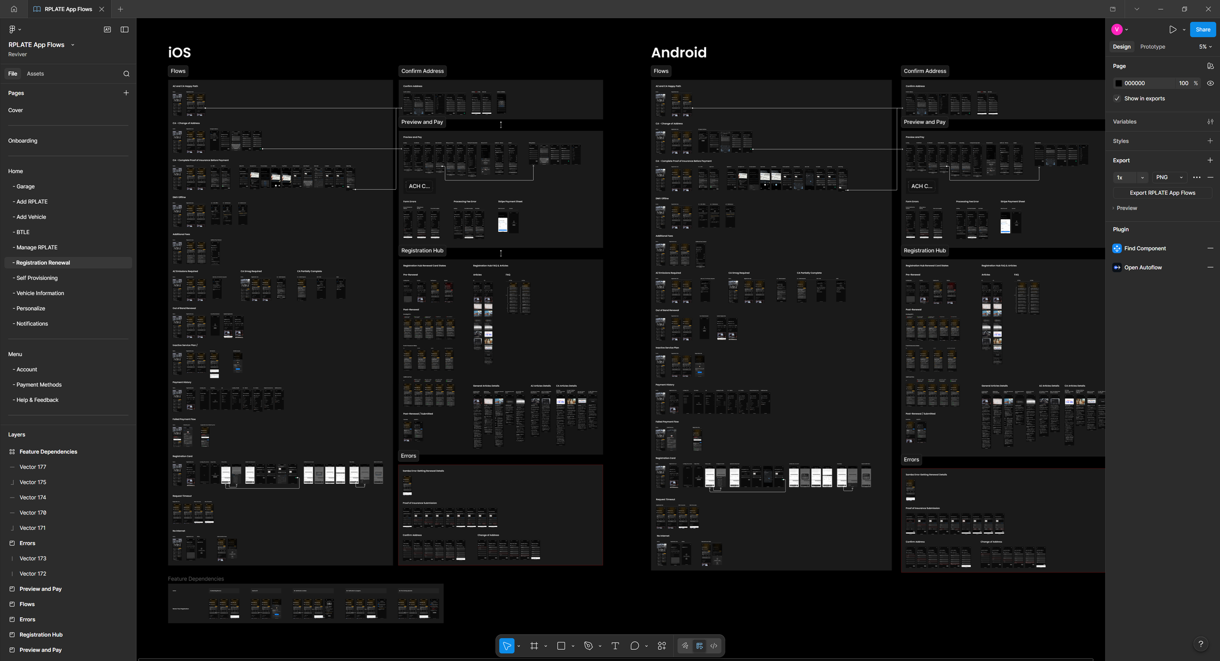 The App Flows file was used to map end-to-end user journeys across the product, connecting individual screens into clear and actionable experiences. It helped define how users moved through key tasks such as onboarding, registration, plate setup, account management, and support-related scenarios. Organizing flows in a separate file made it easier to identify friction points, review logic across states and edge cases, and communicate the overall experience more clearly with product and engineering teams.