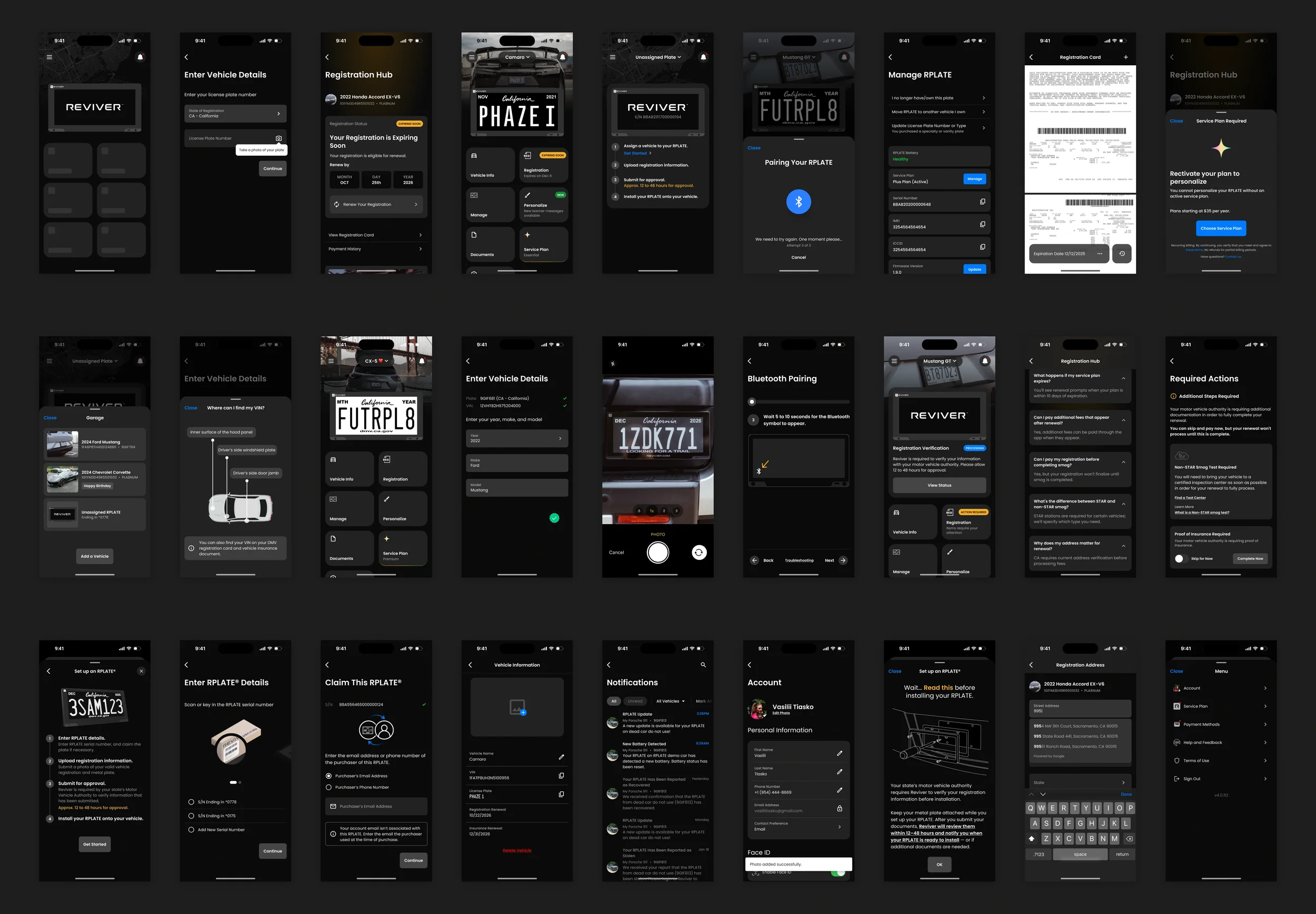 Reviver RPLATE was a complex product to design because it reimagined something deeply traditional — the license plate. Throughout the project, my focus was on understanding user behavior, identifying friction points in the vehicle registration experience, and translating those insights into clearer, more intuitive product decisions. I looked closely at how drivers move through tasks related to registration, account setup, and plate management, with a strong emphasis on usability in moments that are often time-sensitive or stressful. This helped shape a product experience that felt simpler, more connected, and easier to navigate — while also revealing clear advantages unique to a digital plate.